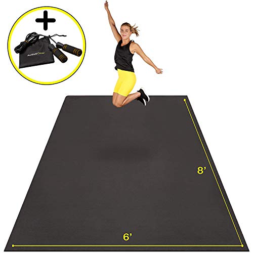 Large Exercise Mat 8′ x 6′ x 7mm | Ultra-Durable Non-Slip Rubber Workout Mat for Home Gym Flooring | Ideal for Cardio, Fitness, Plyo, MMA and Yoga | Jump Rope and Storage Bag Included