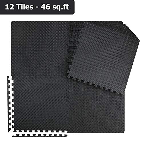 Workout Mat Covers 46 SQ. FT: Each foam floor tile measures 23.6 inches x 23.6 inches x 3/8 inch (600mm x 600mm x 10mm). Package includes 12 BLACK interlocking foam tiles and 24 end borders for a seamless look. Puzzle mats cover up to 46 sq.ft (approx 4.3 sq.m) of floor space, making it a perfect workout and training accessory. - Flooring Mats