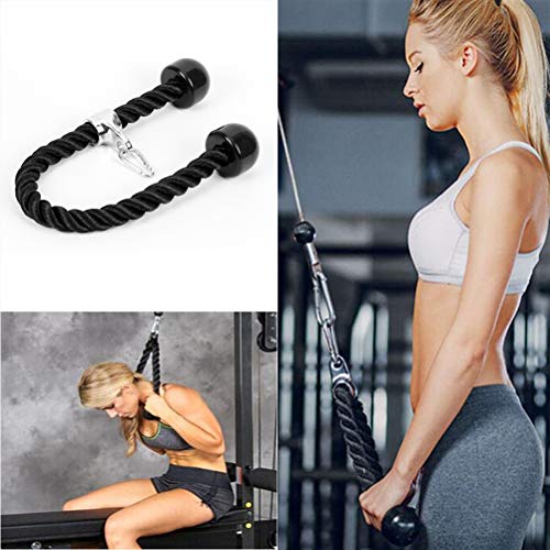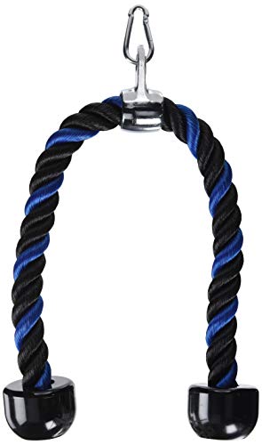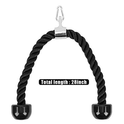 Maximize your at-home workout result with Tricep Rope · Target fibers deep within the triceps · Emphasize the outer portion of the triceps muscle · Put greater emphasis on the long head · Strengthen the three muscles on the backs of your upper arms · Work your shoulders, abdominal muscles and upper back 28-Inch Nylon Braided Rope Constructed of extremely sturdy nylon, Tricep Rope Pulldown can resist abrasions and shrinkage. The flexible nylon braided rope can retain its shape even with continuous workouts. Universal Design Tricep Pulldown Rope comes with a heavy-duty chrome plated attachment to attach to any standard weight-stack cable system for multi-workouts, including press-downs, curls, kickbacks and deltoid raises. Solid Rubber Ends Designed with large rubber blocks at the end of the rope, our Tricep Rope allows for a secure and comfortable grip & prevents slipping or sliding, thus help increase effectiveness while practicing. EXERCISES: Full body workout pull downs, press downs, curls, crunches, kickbacks, bent over row, single leg deadlift, shrugs, choppers, pushing, pulling, knee bending or hip extending. What Included: – 1 x Black Tricep Rope – 1 x Snap Hook