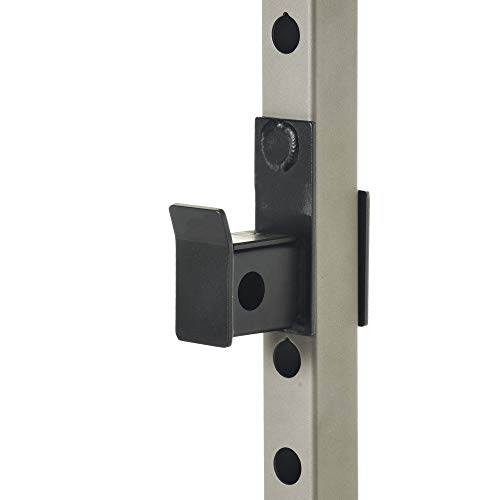 2. 75 inch deep J-hooks and 19. 5 inch long spotter arms with mechanically fixed rubber pads to protect barbell knurling